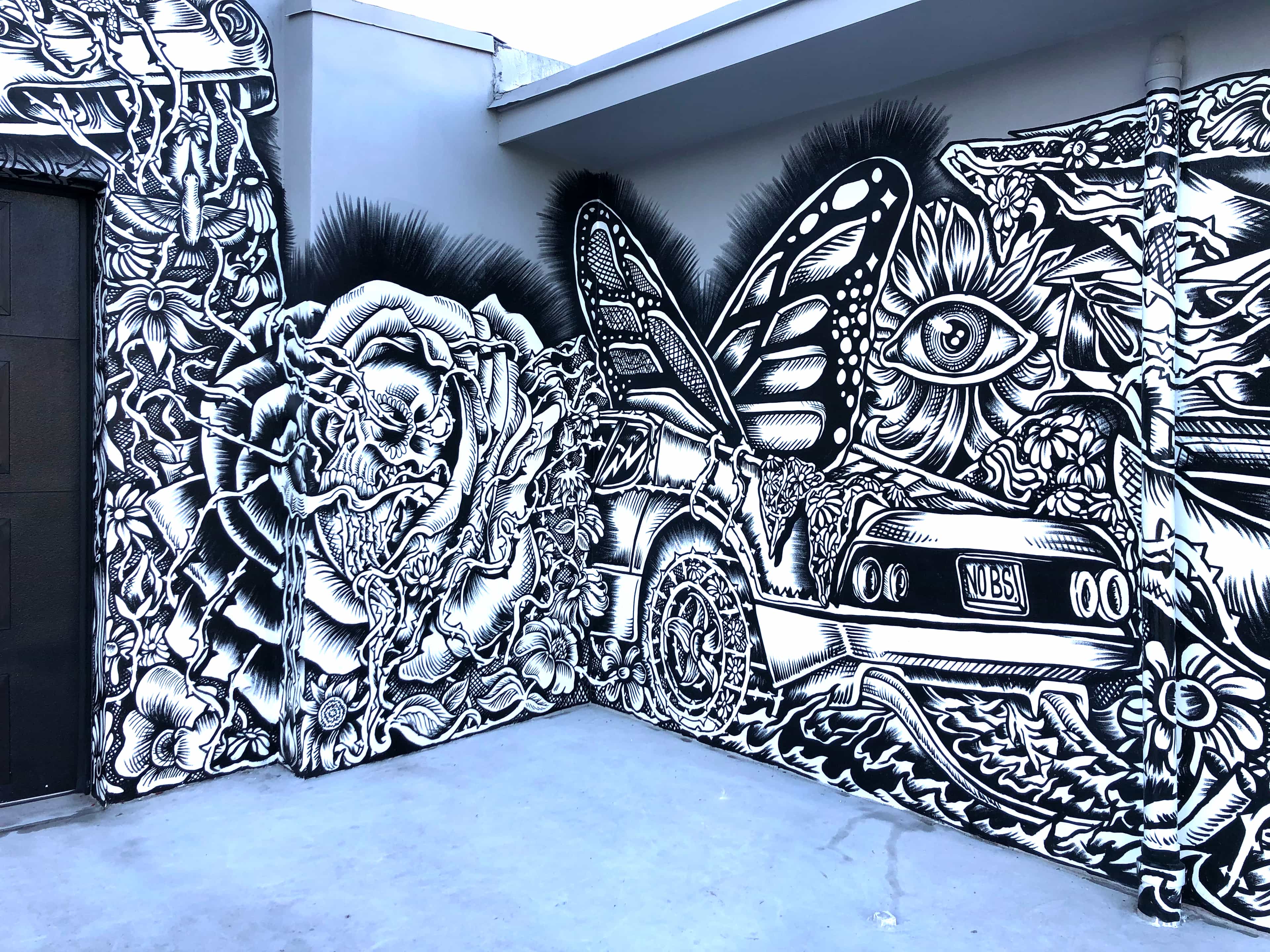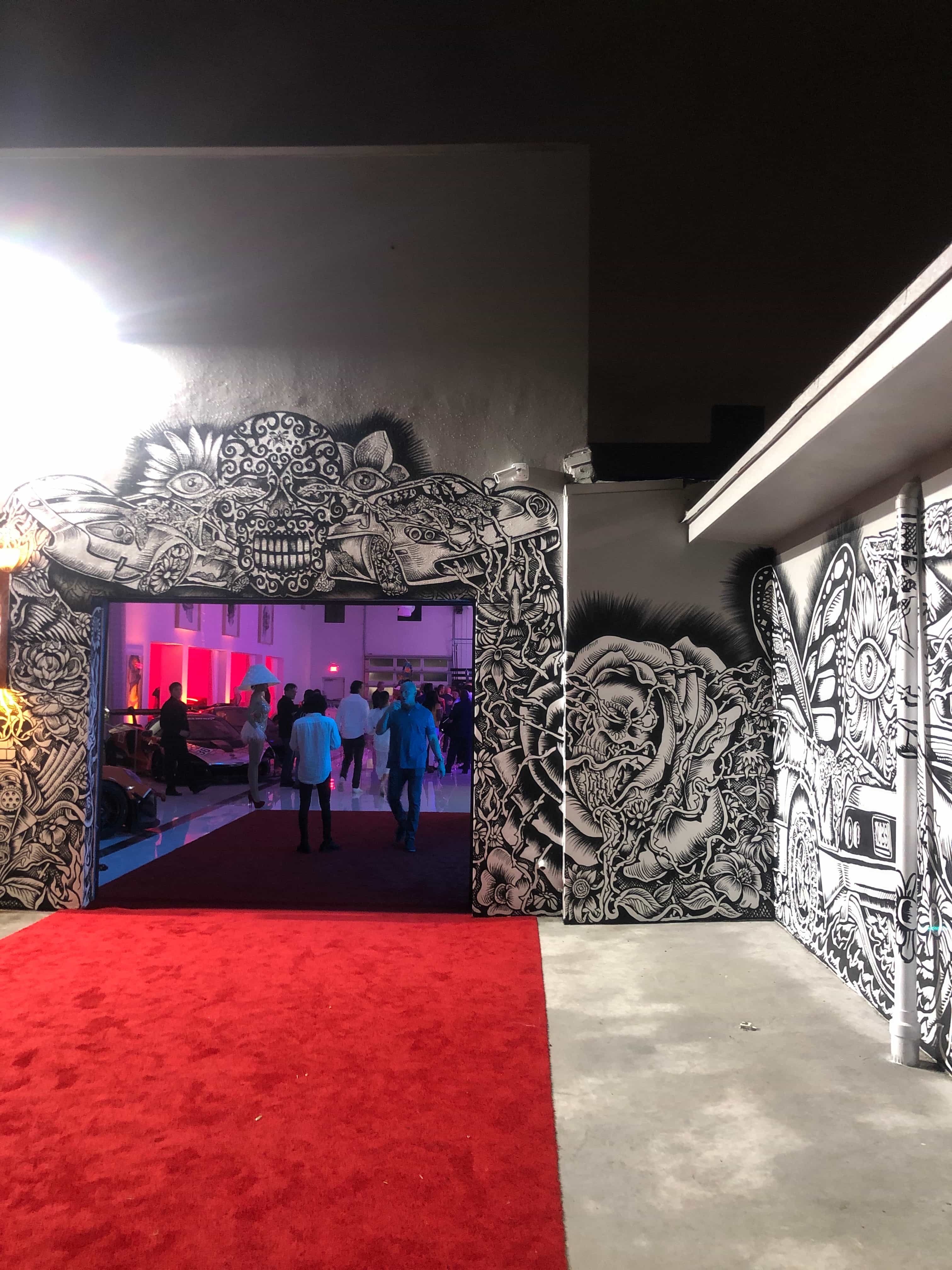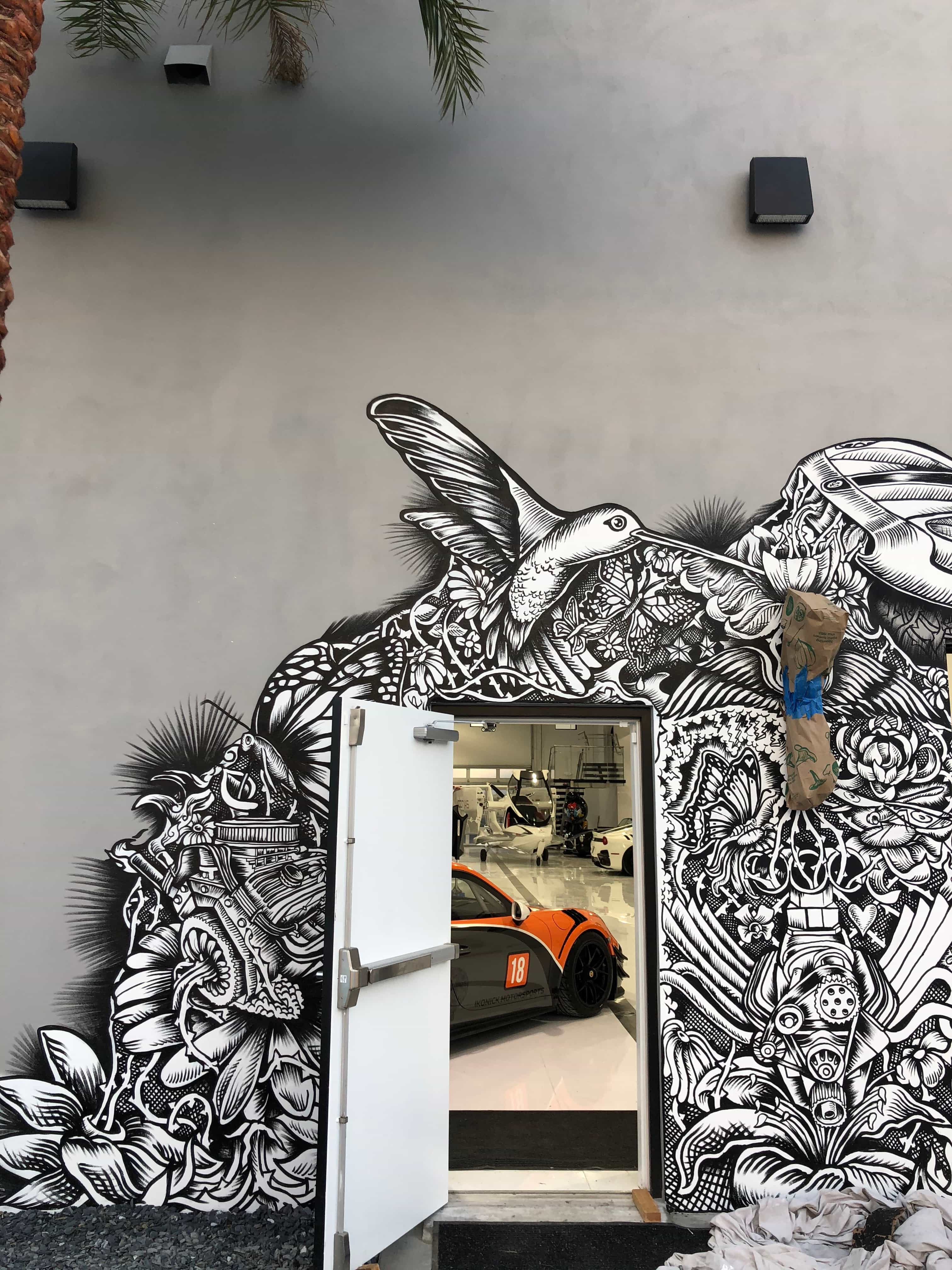 Series of Murals painted for Ikonick Motors car collection decorating the entire facade of the garage.