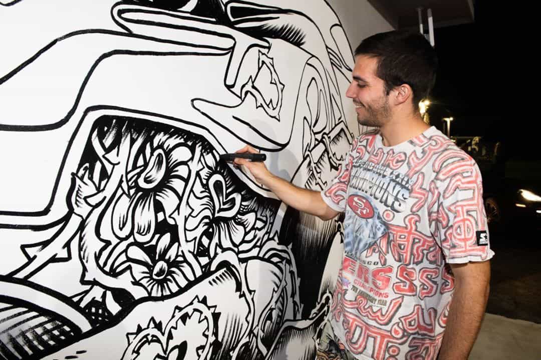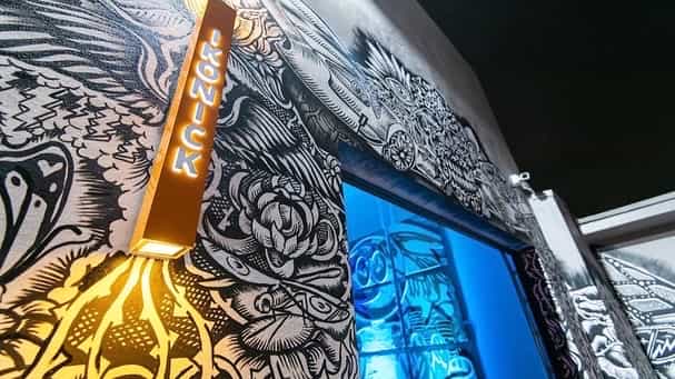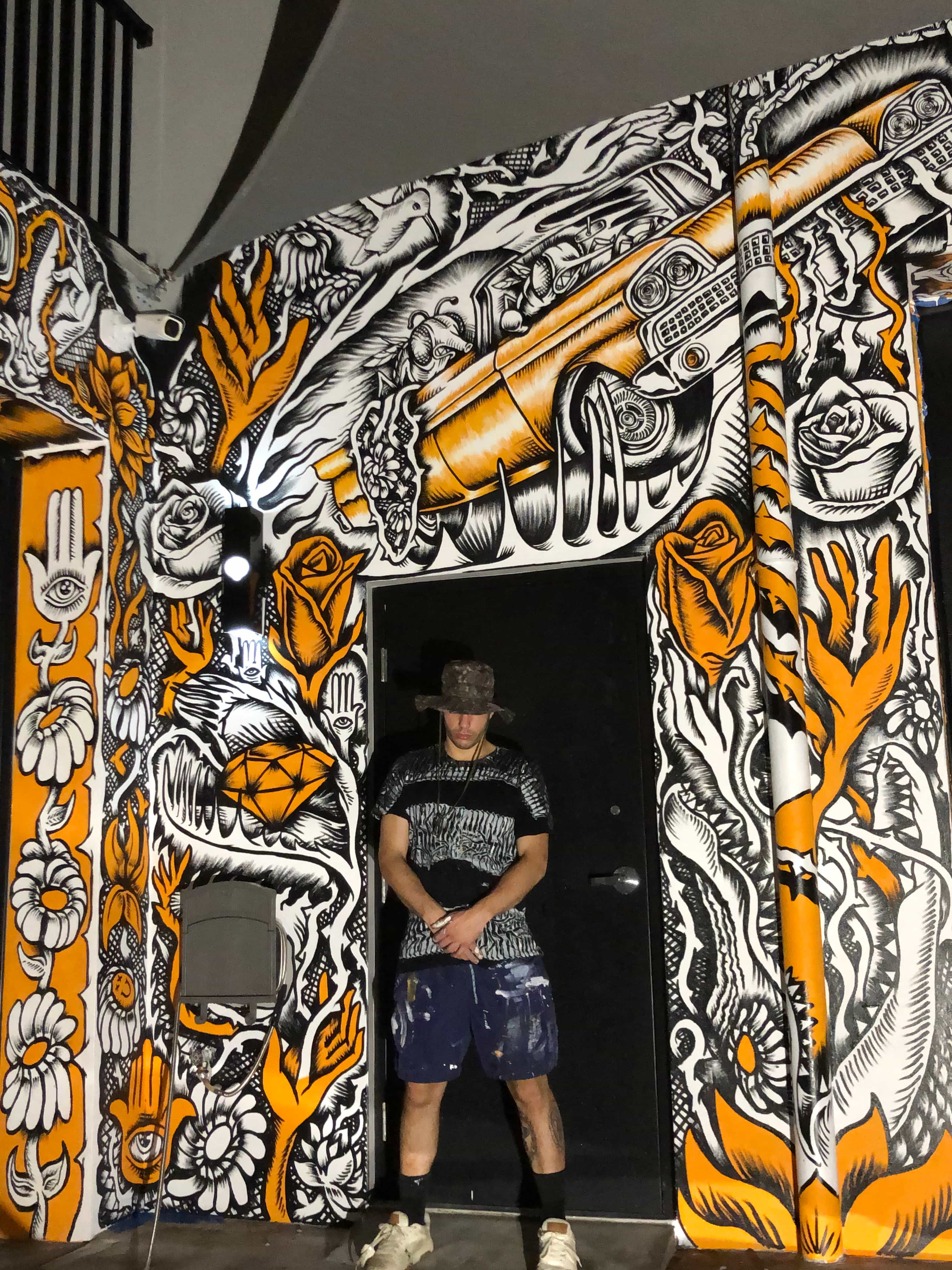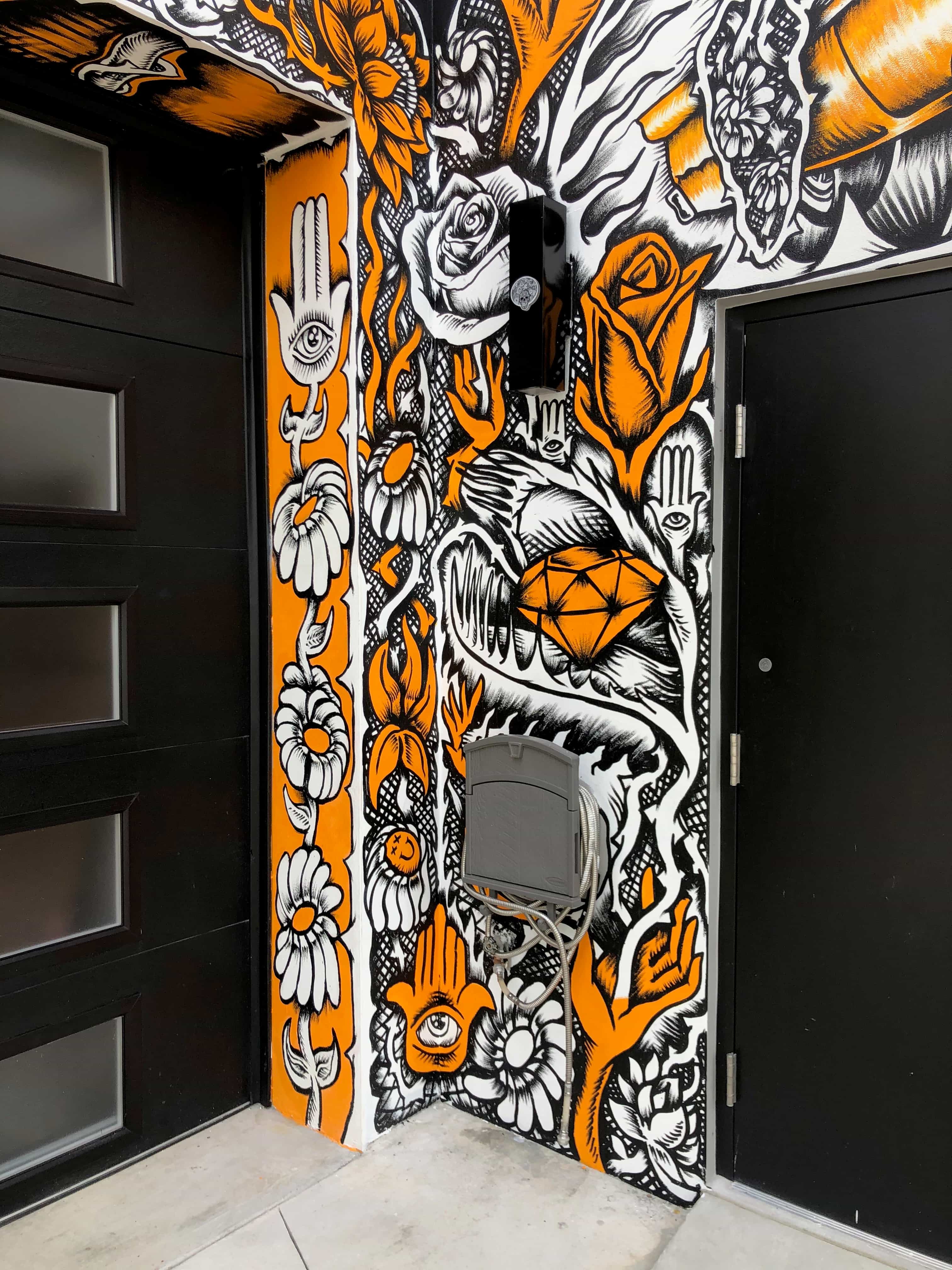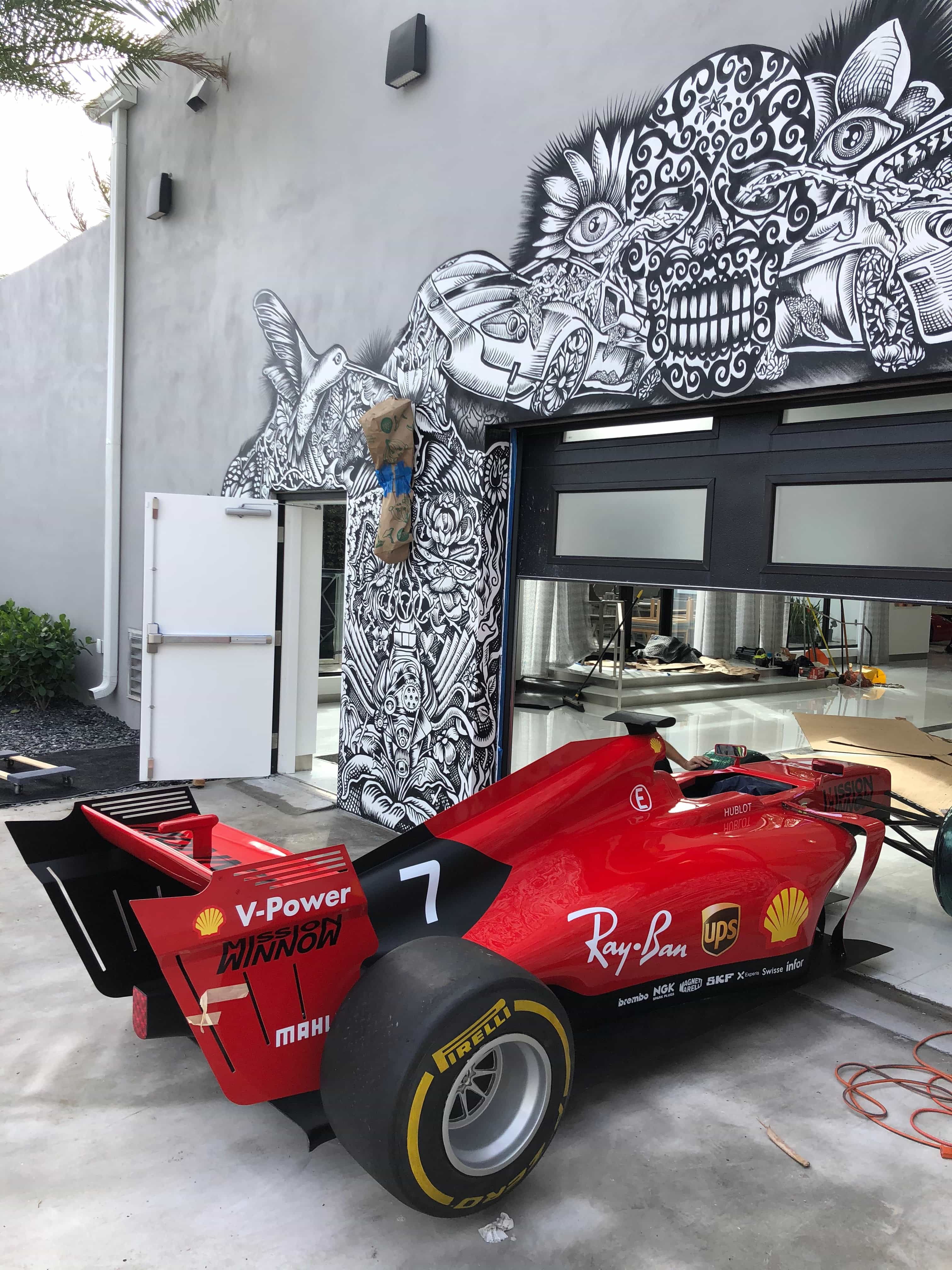 Series of Murals painted for Ikonick Motors car collection decorating the entire facade of the garage.