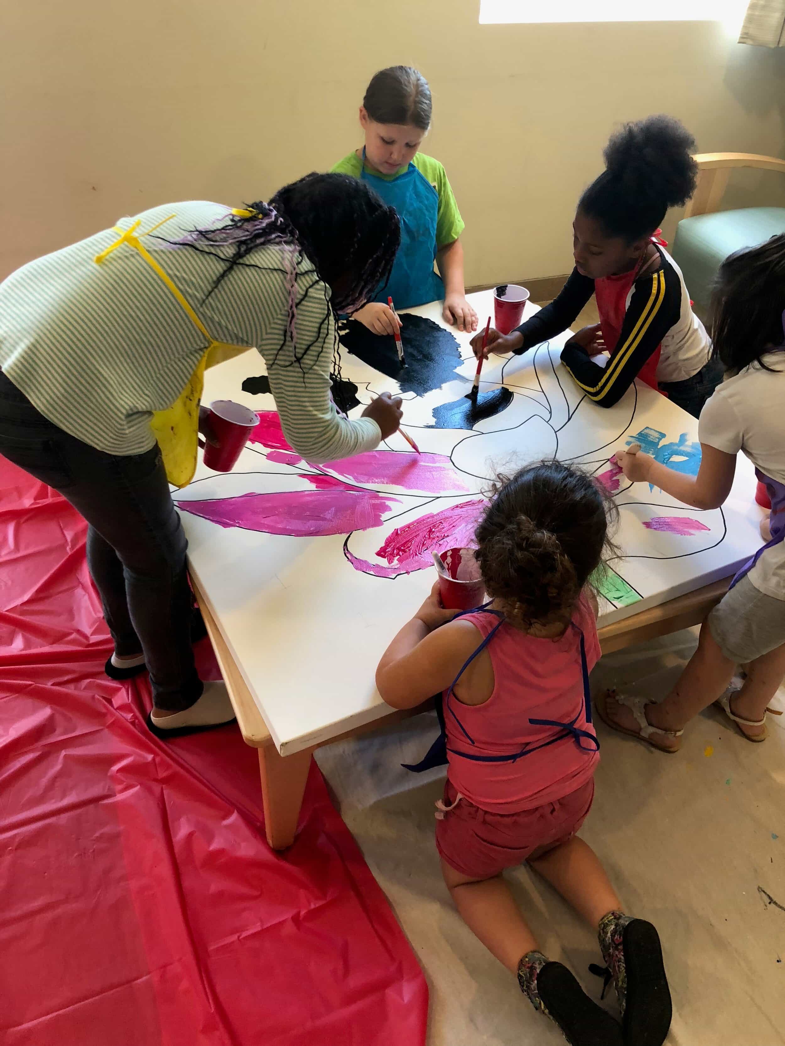 The Lotus House is a unique resource center and residential facility serving homeless women and infants in the heart of Overtown. A spa day for the mothers was set up and I guided a 3 hour art session with their children, so the mothers could take the day off and relax. Together we painted this masterwork, Which became a permanent piece in shelter.
